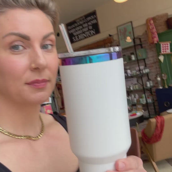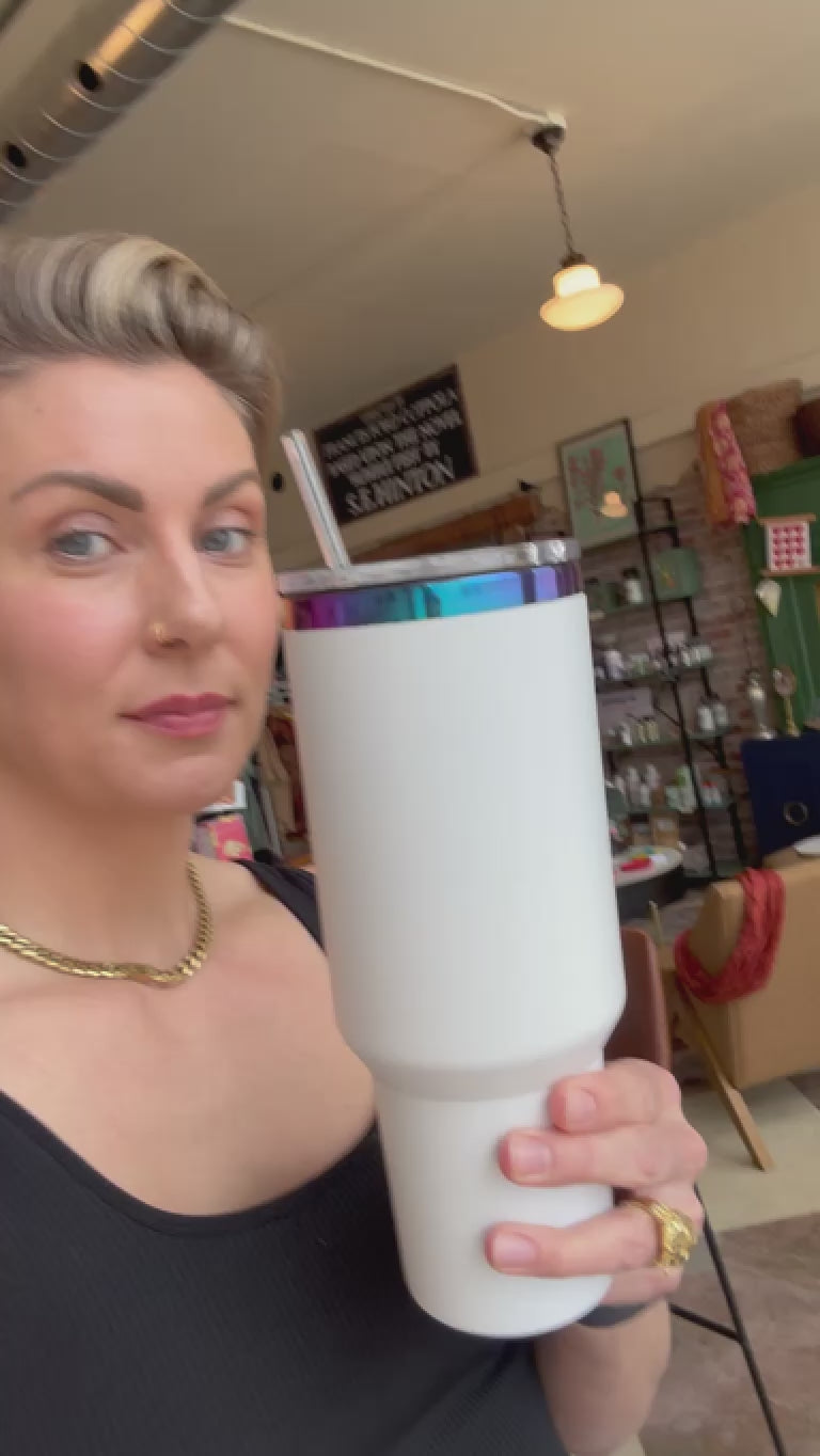 Sip in style with our 40 Ounce Tumbler, offered in two eye-catching combos: black and gold or white and iridescent. Its screw-on lid fits snugly to keep your drink secure, and a clear straw is included for easy sipping. Grab this cool schwag and proudly show off your love for The Bend Mercantile!