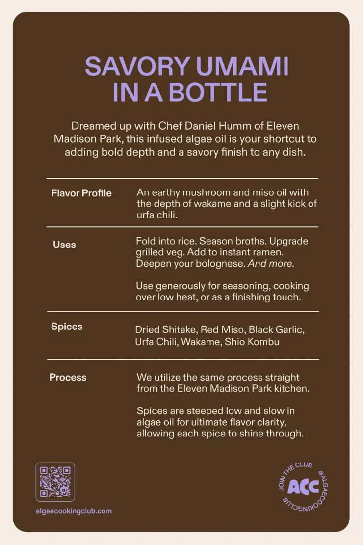 Elevate your dishes with Algae Cooking Club Cooking Oil, infused with the rich umami of Shiitake mushrooms and six carefully selected spices. Inspired by Chef Daniel Humm’s slow eight-hour infusion, this oil brings deep, savory flavor to your kitchen without the wait. Perfect for adding a playful twist to everyday cooking, it’s like having a gourmet secret in a bottle!