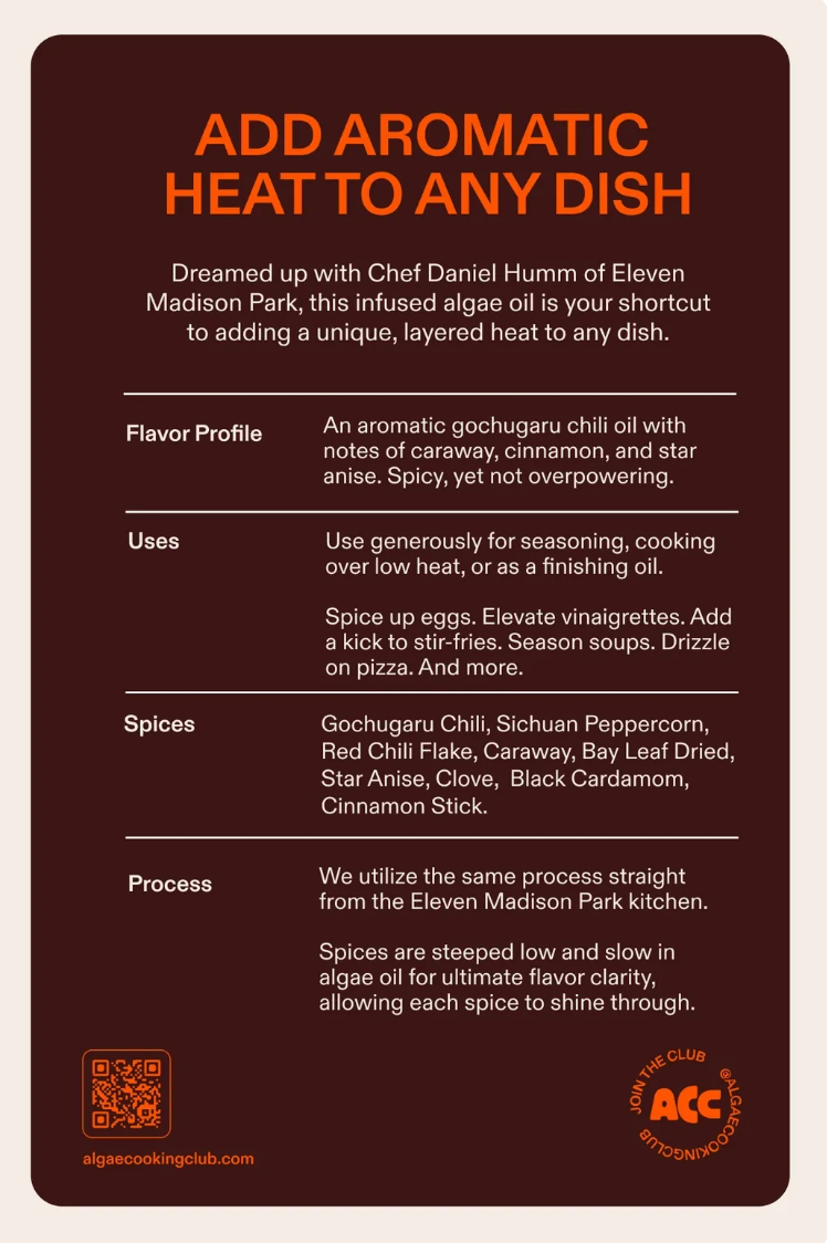Combining the bright heat of Gochugaru chili with warm notes of cinnamon and star anise, this infused algae oil offers a smooth, aromatic heat to enhance any dish. Developed in collaboration with Chef Daniel Humm, it's gently steeped with real spices over low heat, just as it’s done at Eleven Madison Park.