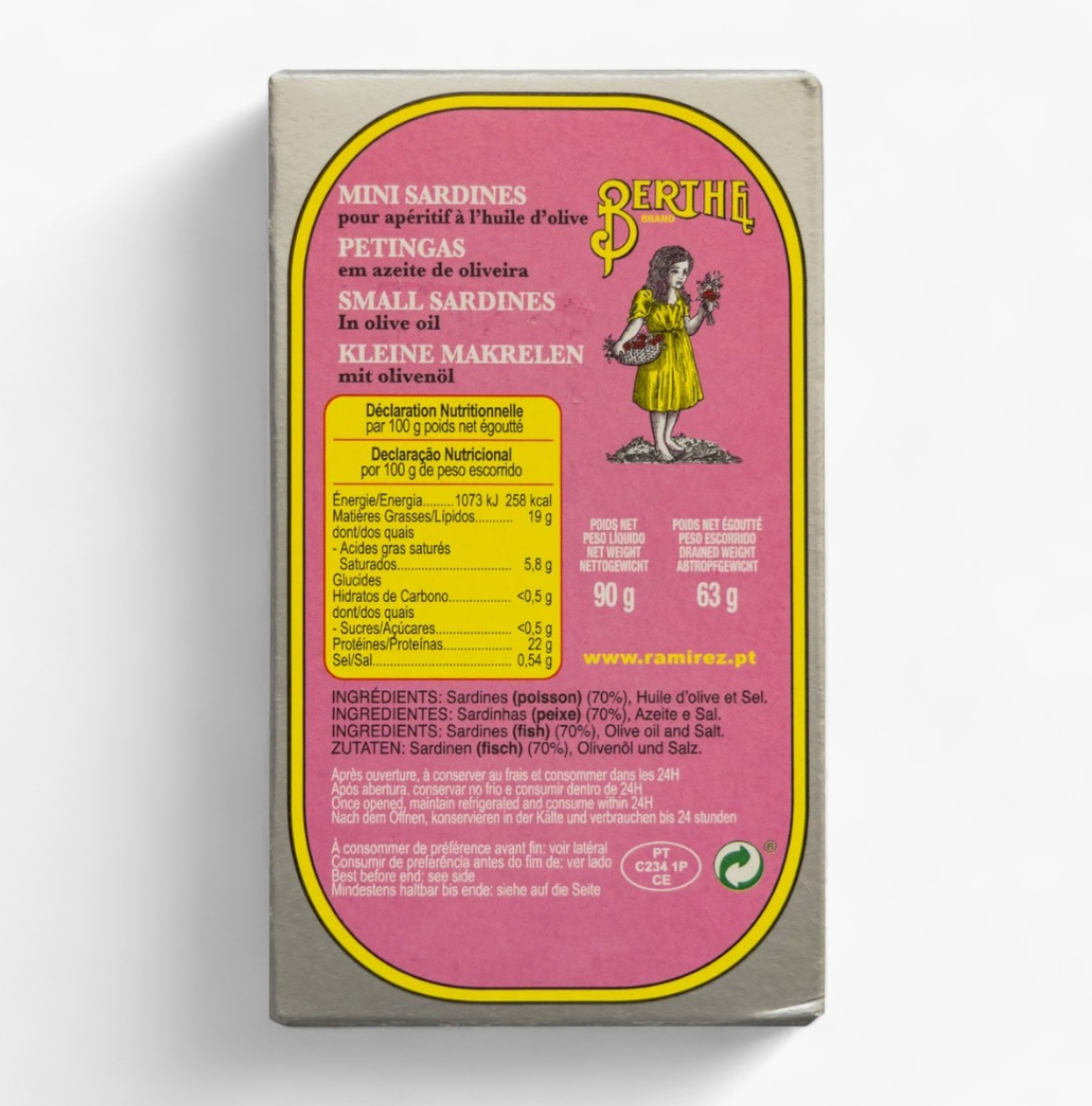 Experience the unforgettable taste of Berthe Mini Sardines (Petingas) in Olive Oil. These "mini sardines" are a contemporary gastronomy favorite, enhanced by the healthy benefits of olive oil. Irreverently delicious, just like the Mediterranean diet.