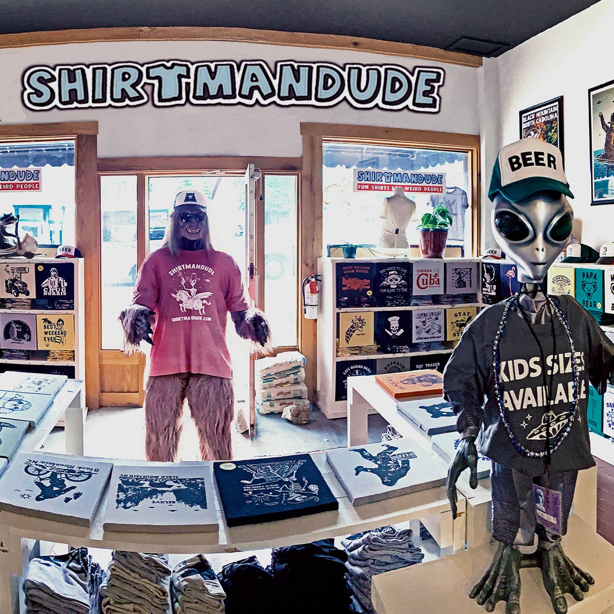 We are a t shirt shop in Asheville, NC that creates original graphics and hand prints them onto super-soft tees. We are always coming up with funny shirts, weird tees and cool graphic shirts with a retro vintage feel.