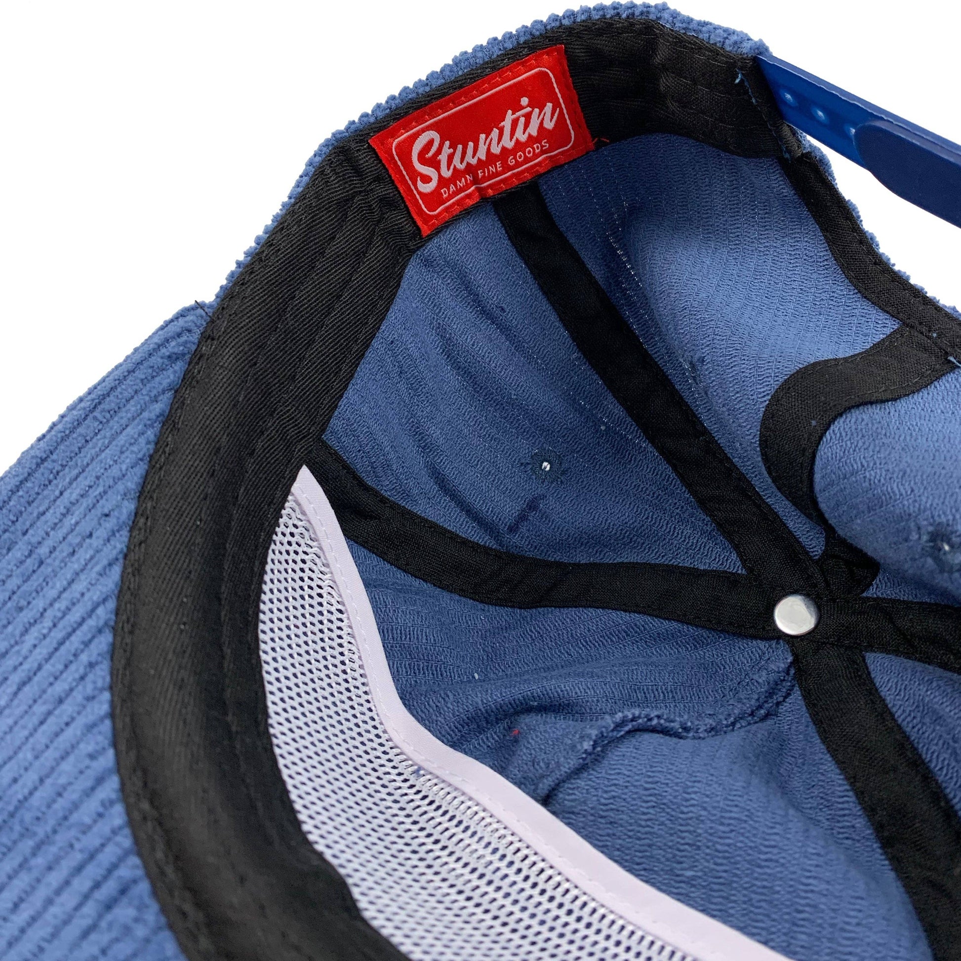 For the ramblin' man and eclectic grandpa alike, an unstructured baseball-style adjustable cap made of smokey blue corduroy fabric with a red and cream embroidered patch.