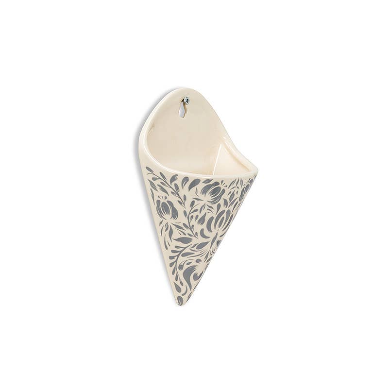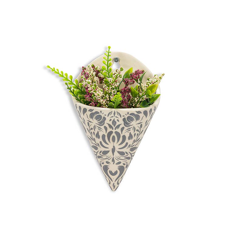 Bring elegance to any surface with this classic, understated Cone Wall Vase in Ivory and Dark Grey. Crafted out of stoneware, its sleek, sensuous design is complemented by a classic floral filagree pattern in dark grey that stands out from its ivory surface, elevating all your favourite blooms. Other colours also available.