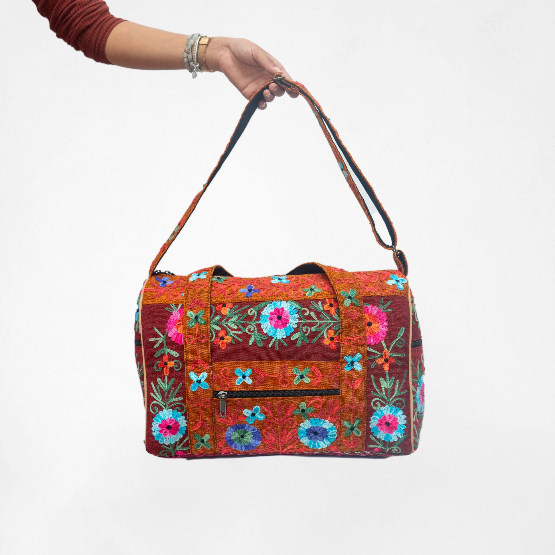 This mini travel bag is very convenient to carry either in shoulder or can be carried diagonally across the body. It has beautifully embroidery adjustable strap. Furthermore, this bag has same beautiful embroidery on both side. It has five pocket, main is for cloths and important essentials. Side pocket on the both side can be used for napkins, hanker-chief, passport and some small money. Moreover, it has two small pocket makes it ideal for carrying essential things like key, lip balm, cards, earPods. Mini embroidery travel bag has artisanal design which elevate any outfits. Whether exploring new cities or running errands, this bag is functional
