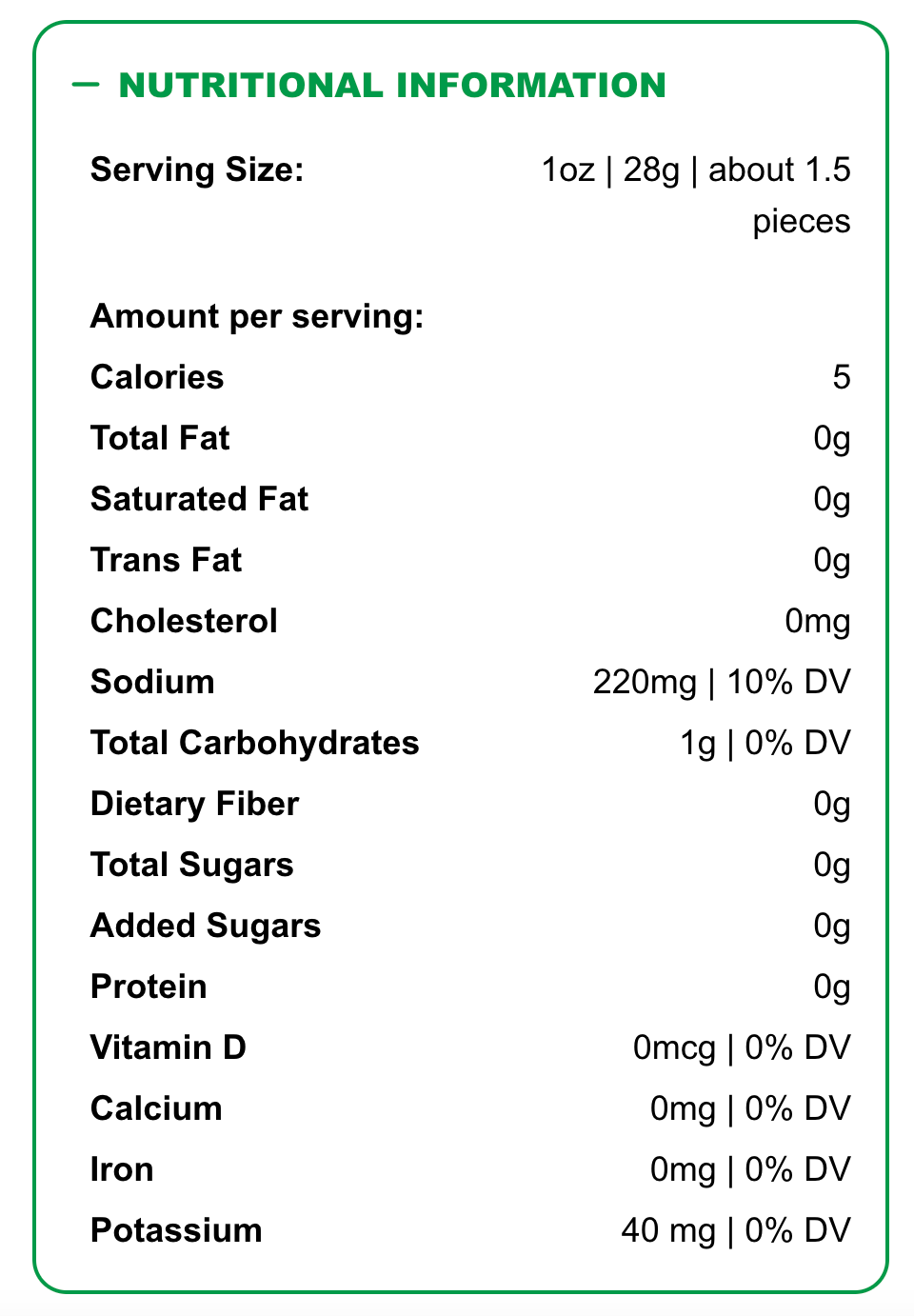 Ingredients: Cucumbers, Brine (Water, Distilled White Vinegar, Salt), Garlic, Dill, Grape Leaves