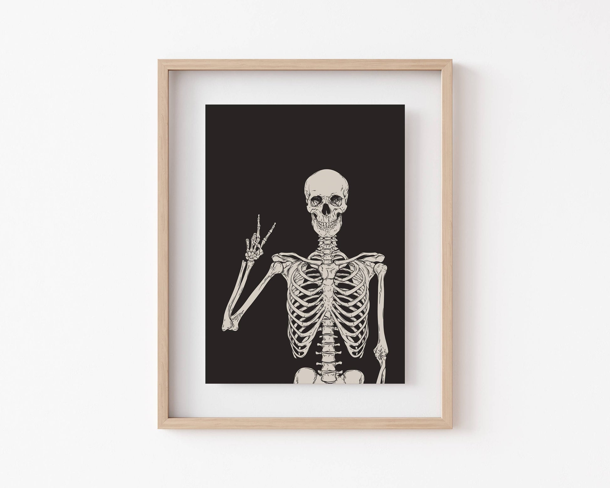 A funny and spooky wall art print featuring a skeleton throwing the peace sign. This art print would add a touch of gothic charm to any space! Available in two standard sizes that are ready-to-frame! Please note frames are not included in your purchase.