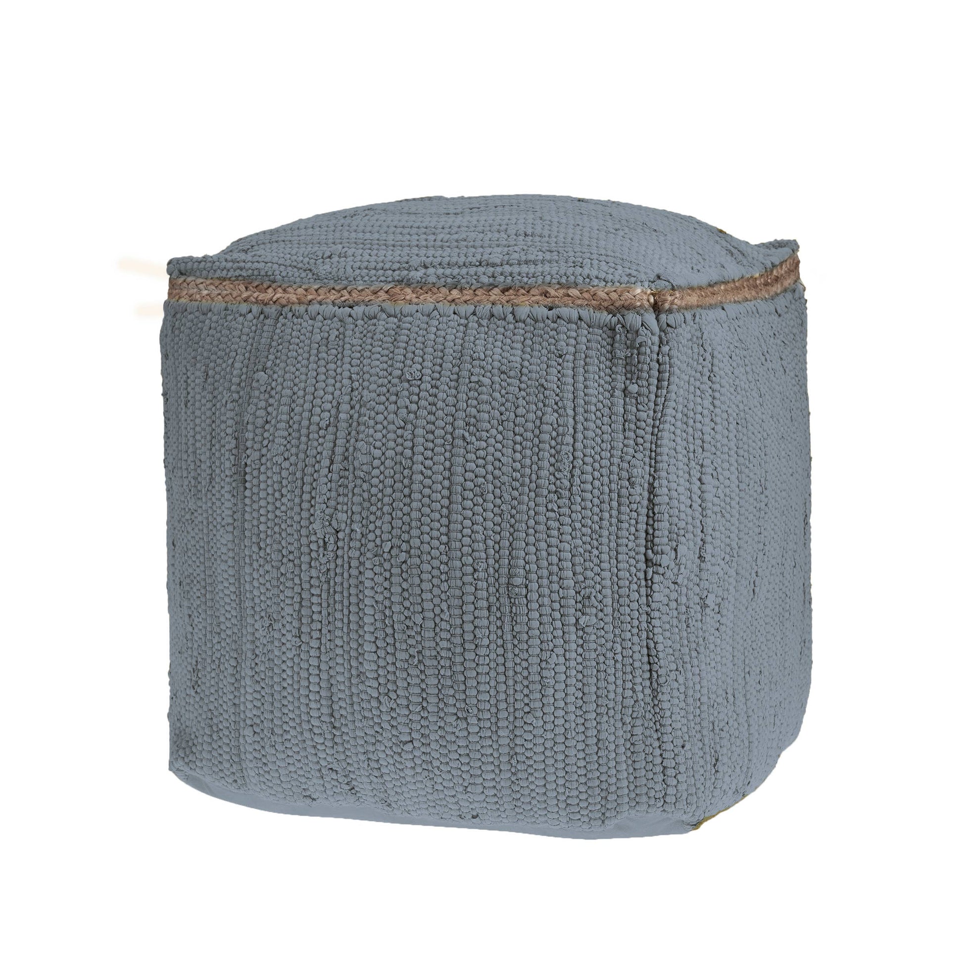Providing function and fashion in one charming package, this pouf brings rich textured weaving and classic design into your space. With a neutral, solid base color featuring a pop of natural jute braiding, this handmade piece will fit into a variety of spaces in your home. Easily tucked away or toted to another room in your home, use this all-in-one pouf as an additional seat, footrest, stool, ottoman, side table, or just stylish décor.