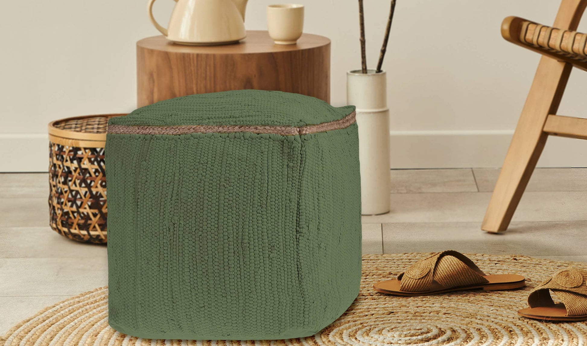 Hand-Loomed Organic Cotton Pouf with Jute Braid: Grasshopper