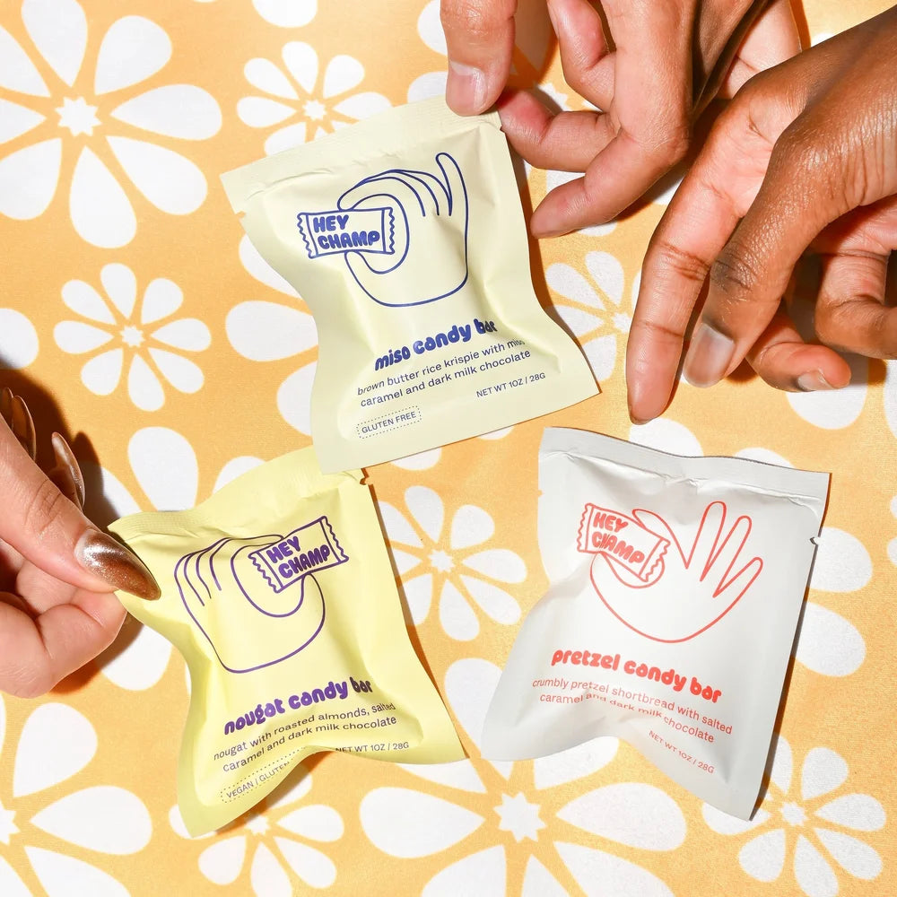 "Get ready to satisfy your sweet and salty cravings with Hey Champ Candy Bars - handcrafted in Eastside LA! Made with top-notch ingredients and attention to detail, these grown-up treats (our best seller!) feature a delectable combo of pretzel shortbread, salted caramel, and dark milk chocolate. When high meets low, it's a win-win for everyone. Don't miss out!"