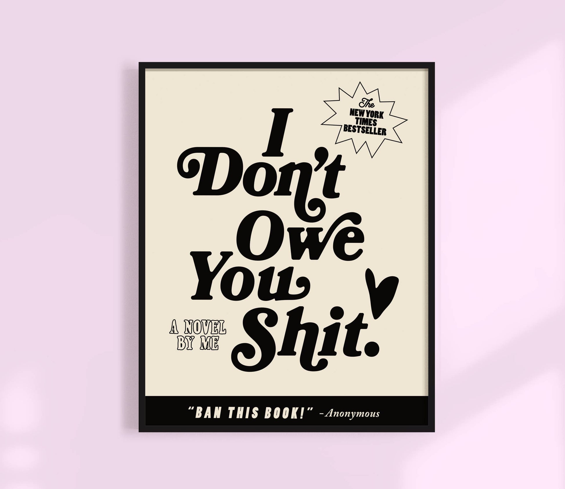 I don't owe you shit Print. Funny Feminist Quote. Book Cover: Black / 8 x 10"