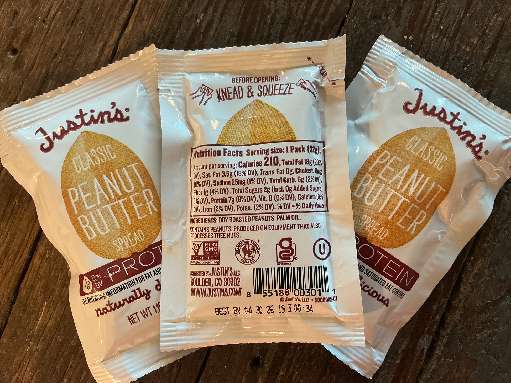 "Get your protein fix with Justin's Peanut Butter Spread! Made with 7 grams of protein and free of gluten and GMOs, this classic spread contains orangutan friendly palm oil. Plus, it's conveniently sized at 1.15oz for on-the-go snacking. (No monkeys were harmed in the making of this spread!)"