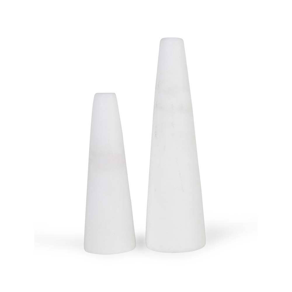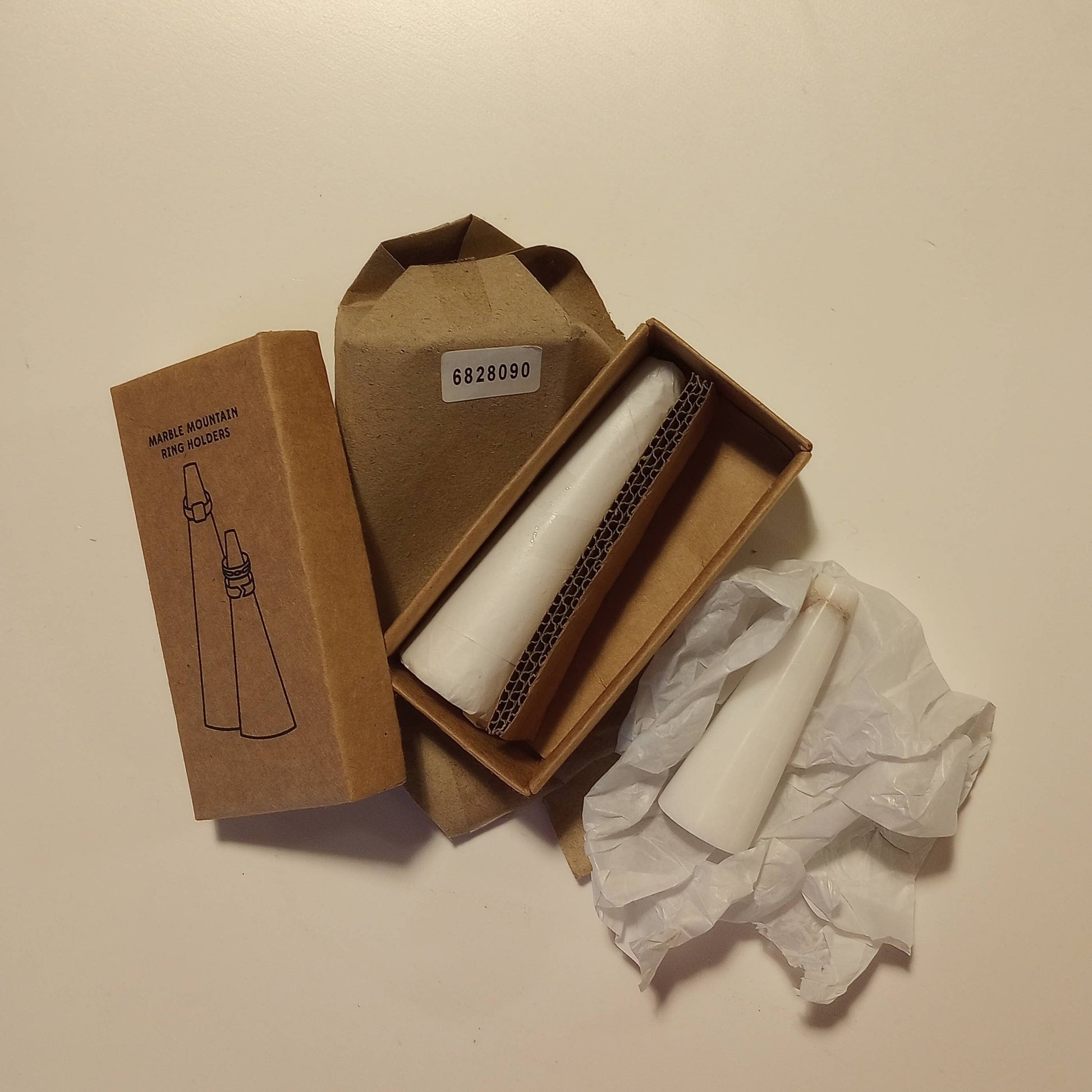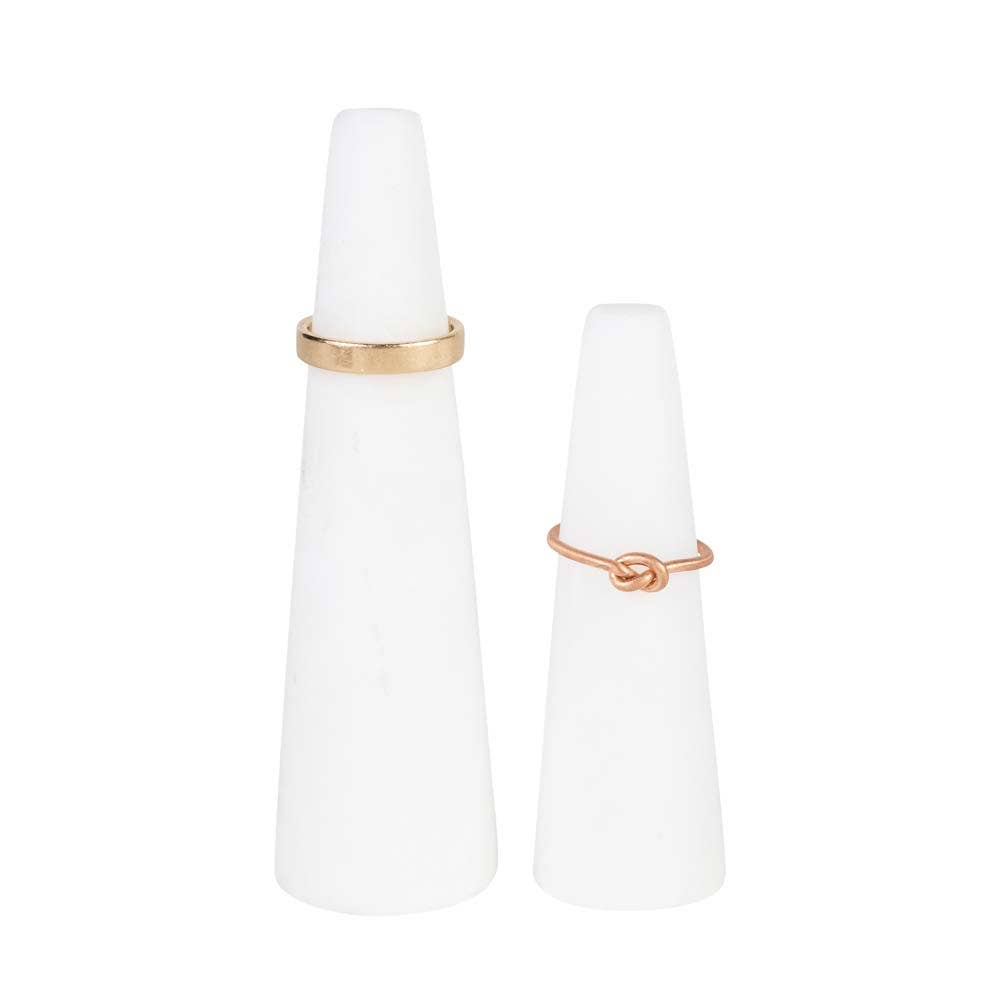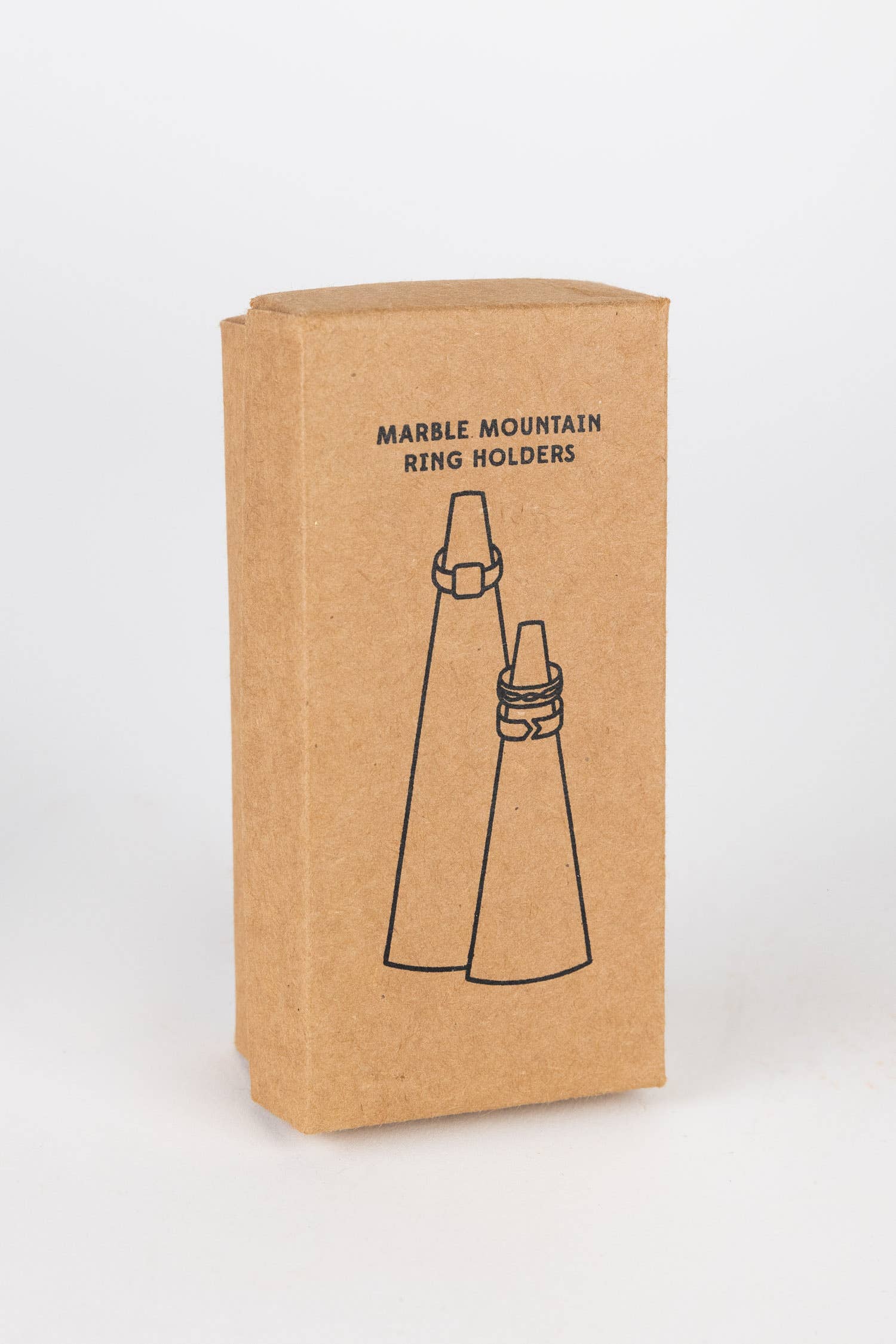 Looking for a unique way to display your favorite jewelry? The Marble Mountain Ring Holder Pair hold several rings each in a modern display on their marble cones. Material: marble - One 3"H & one 4"H Cone - Set includes 2 ring holder cones in 2 sizes. They come together in a kraft paper giftbox. - Rings not included - Handcrafted in India