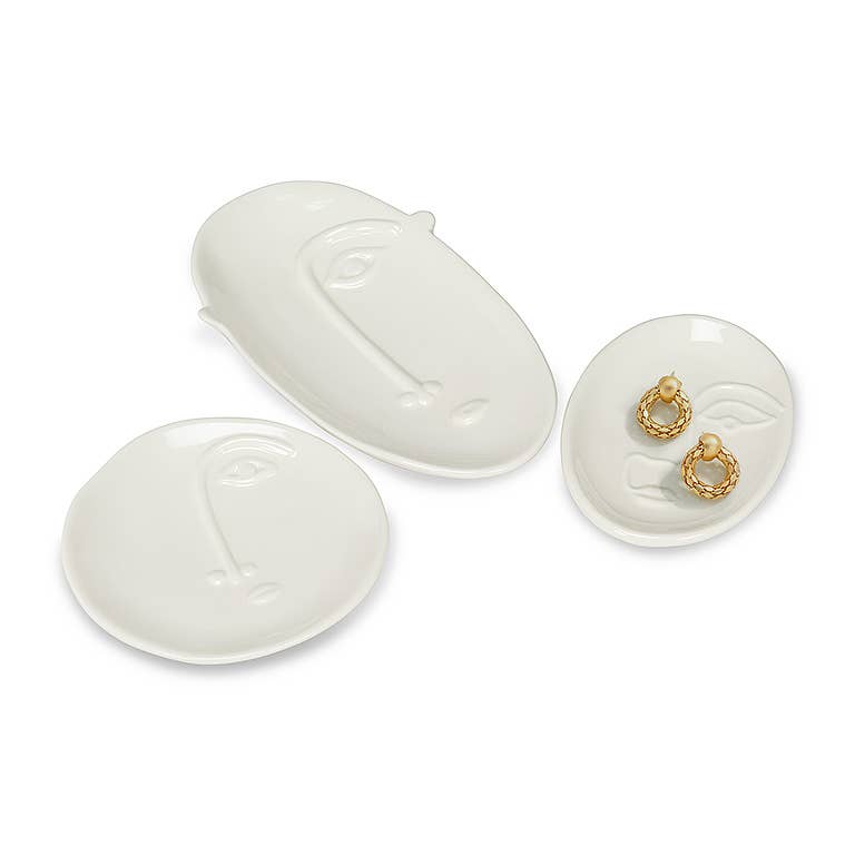 Put a stylish face behind your jewelry, keys, coins, and more with this Medium-sized Long Embossed Face Plate. Crafted out of porcelain, this long oval-shaped white plate is embossed with a few simple details that create a stunning Expressionist portrait to accent everything from keepsakes to coins. Other Embossed Face Plates are also available.