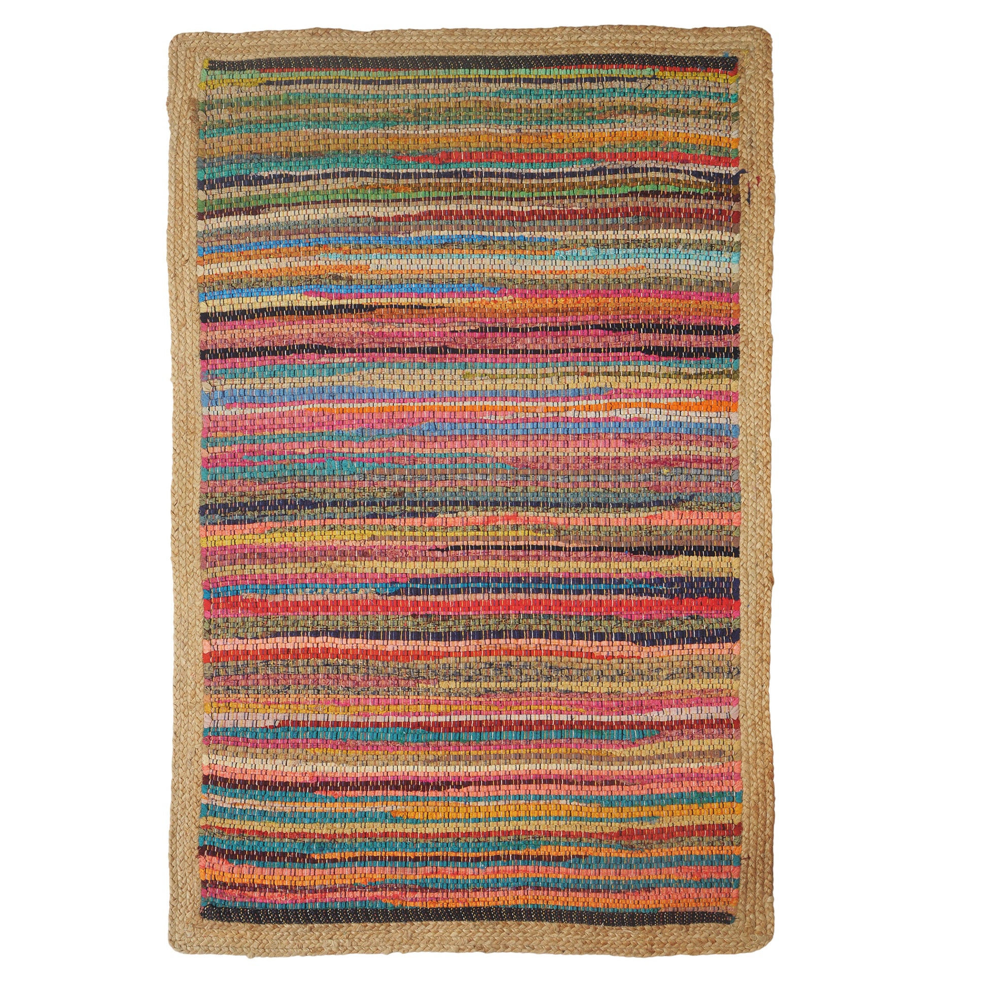 Look no further for a wonderful boho pop of color for any shop! This handmade accent piece brings unique collisions of colorful cotton in textured stripes with a braided jute border.
