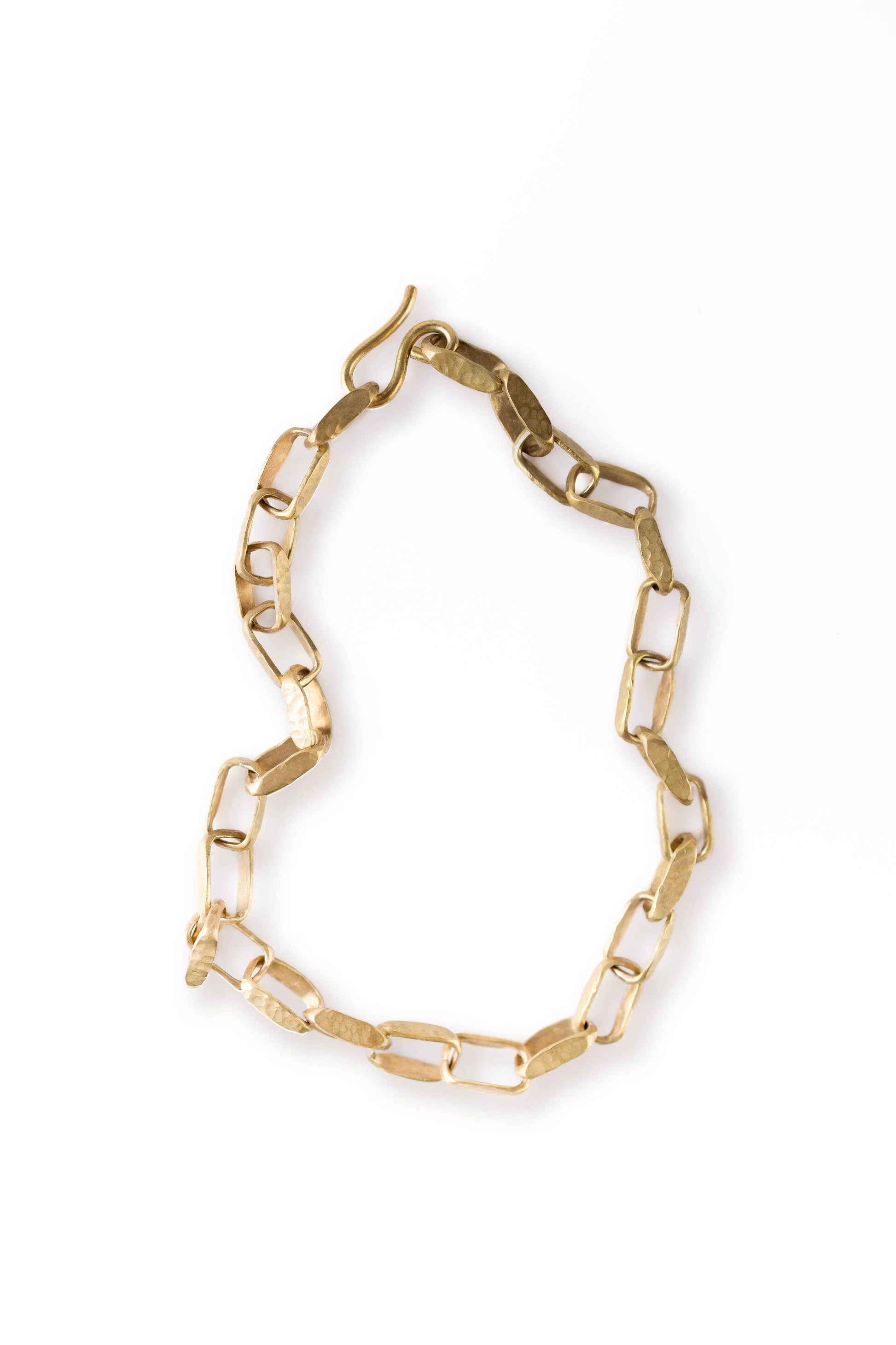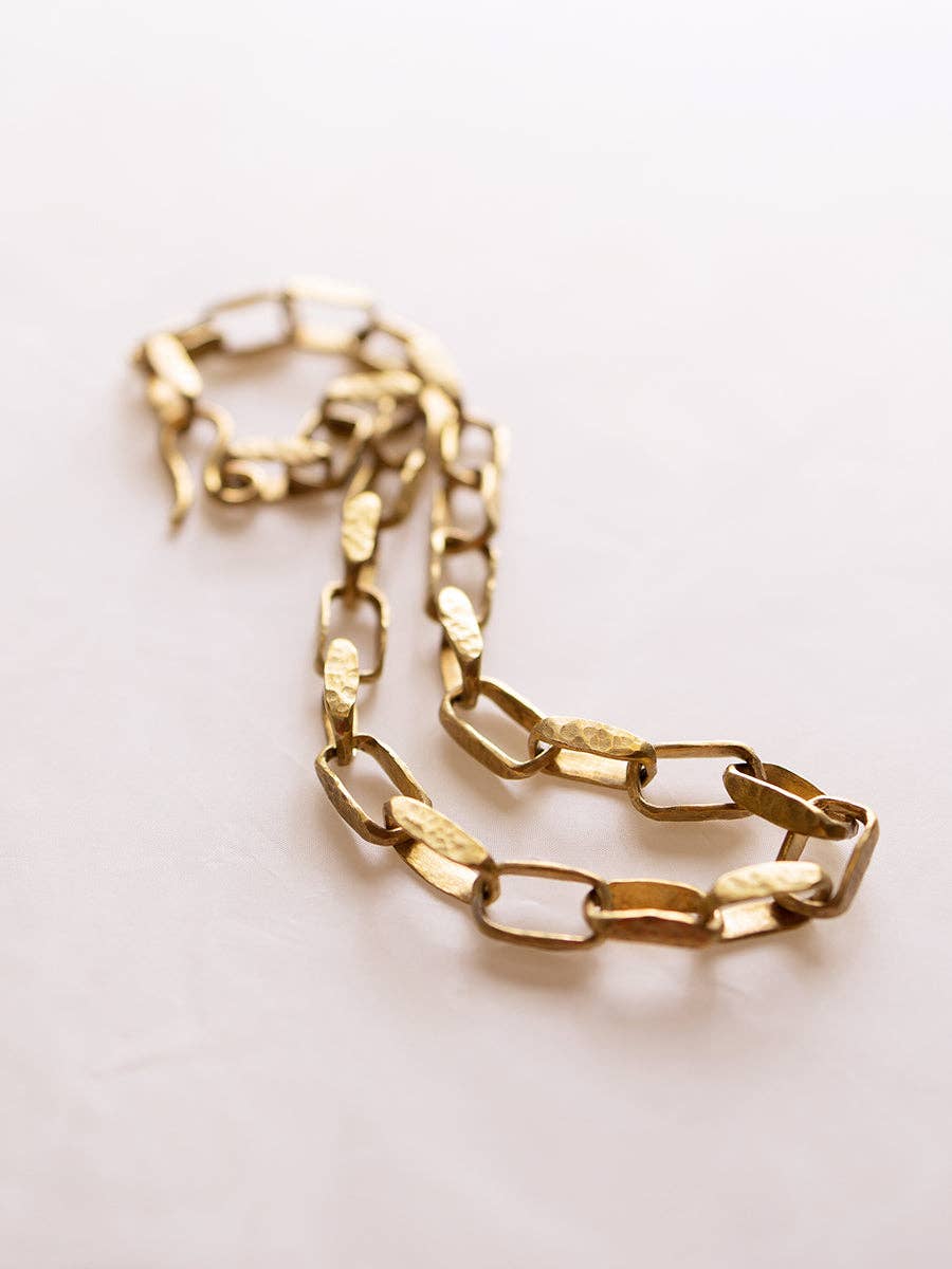 This bold statement necklace is our new favorite at Jimani. Each link has been hand cut, soldered and hammered by skilled artisans in the Kibera area of Nairobi, Kenya. The irregular shape of each solid brass link gives this piece a unique, organic look. It is made of solid, polished brass with a handcrafted hook that can be secured on any link to adjust the necklace length.