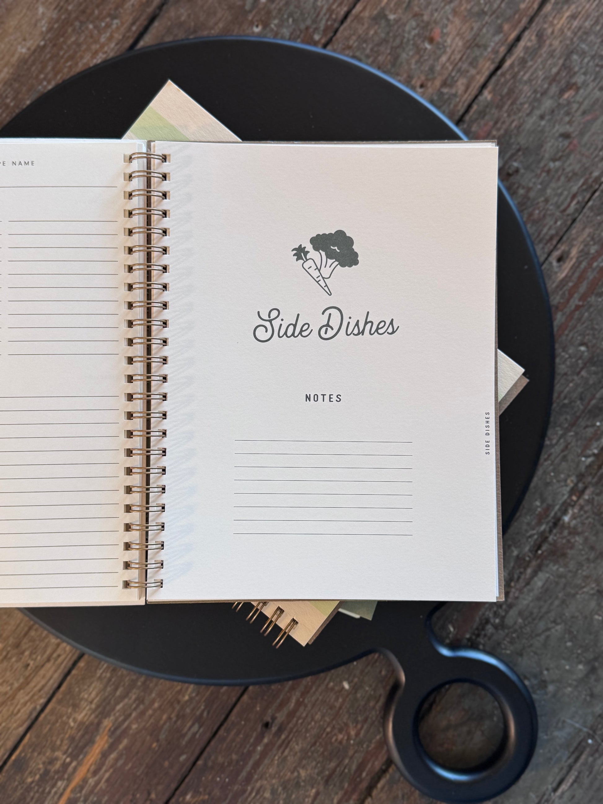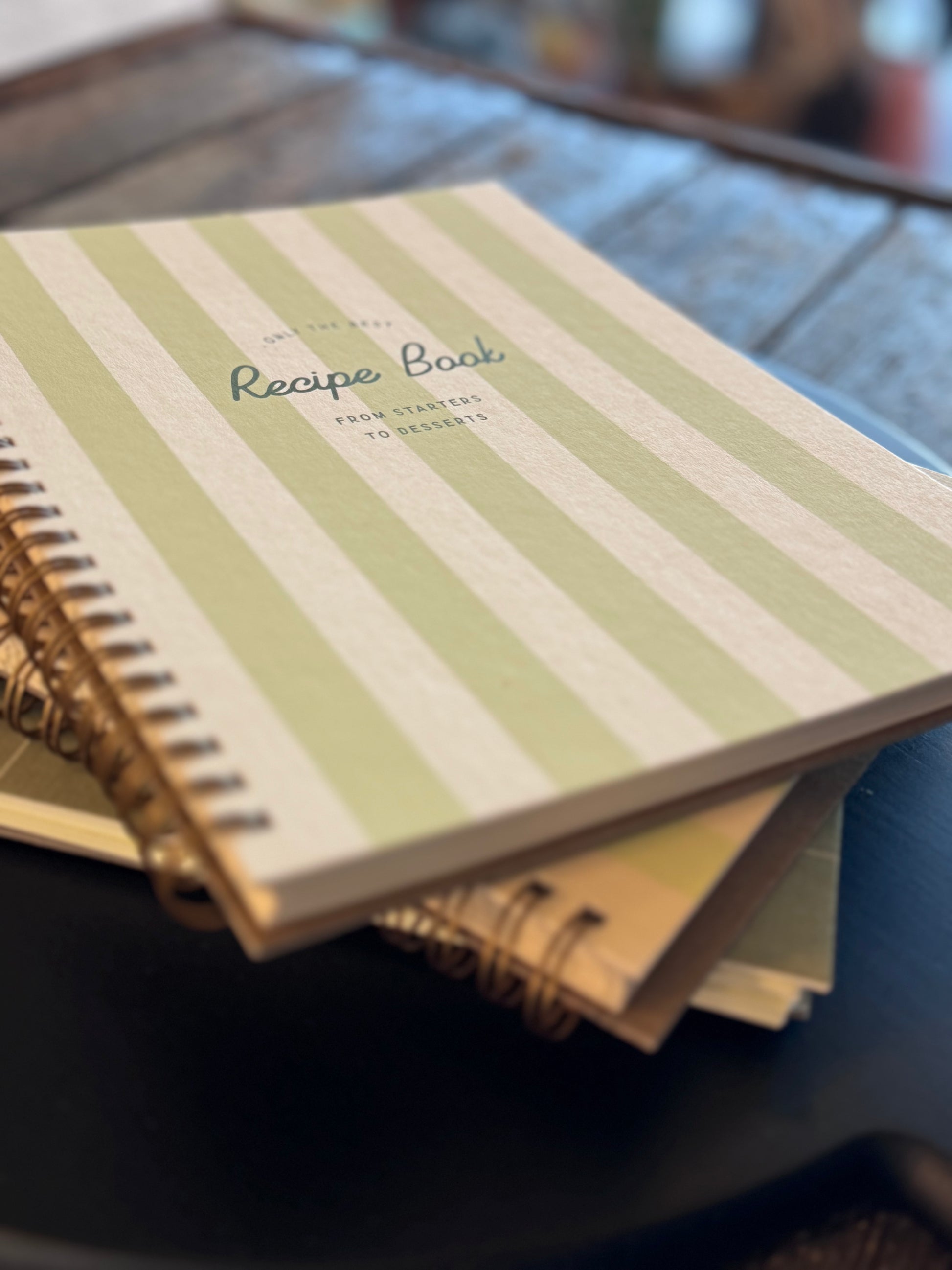The Only The Best Striped Recipe Book includes 5 categories: Soup & Salad, Starters & Snacks, Side Dishes, Main Dishes, and Desserts & Drinks. Each category contains 10 double-sided recipe sheets with space for 20 total recipes. The Main Dishes section has 5 extra recipe sheets, with space for 30 recipes.