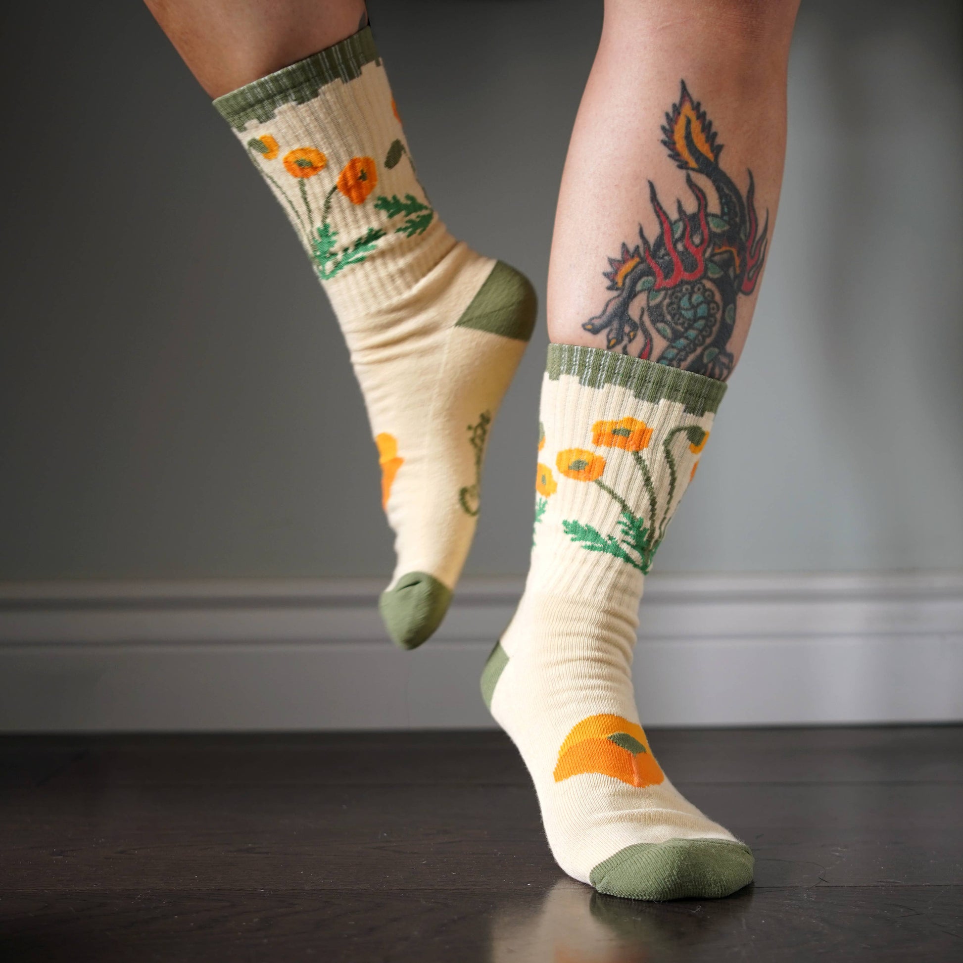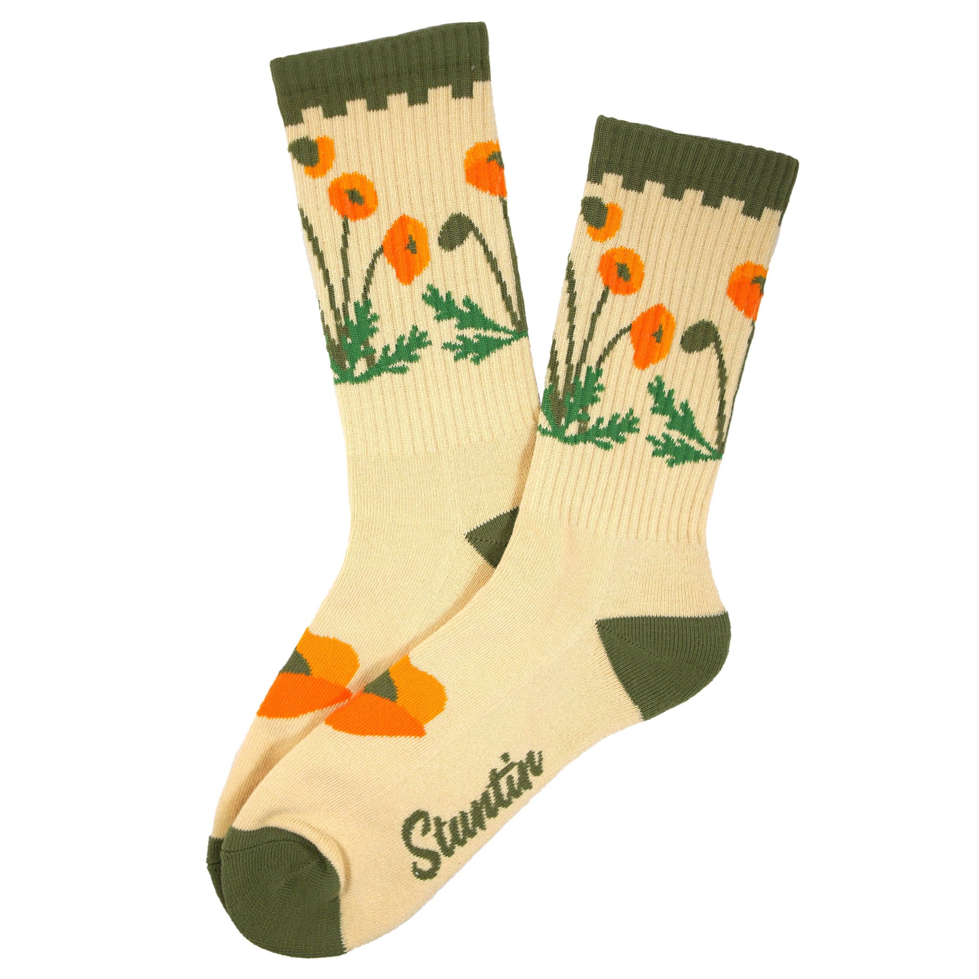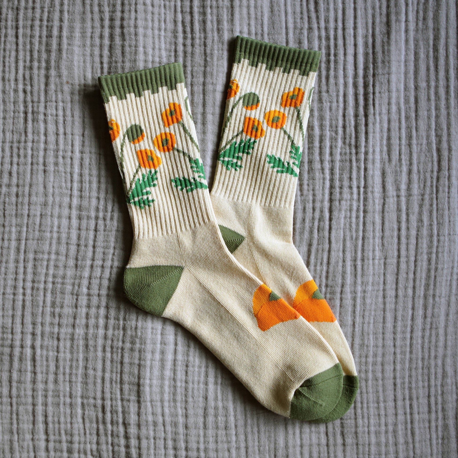 Bright orange poppies bloom on a sandy beige backdrop, like California poppies in the high desert. A poppy adorns the top of the foot with smoky green accents on the top of the cuff, heel and toe.