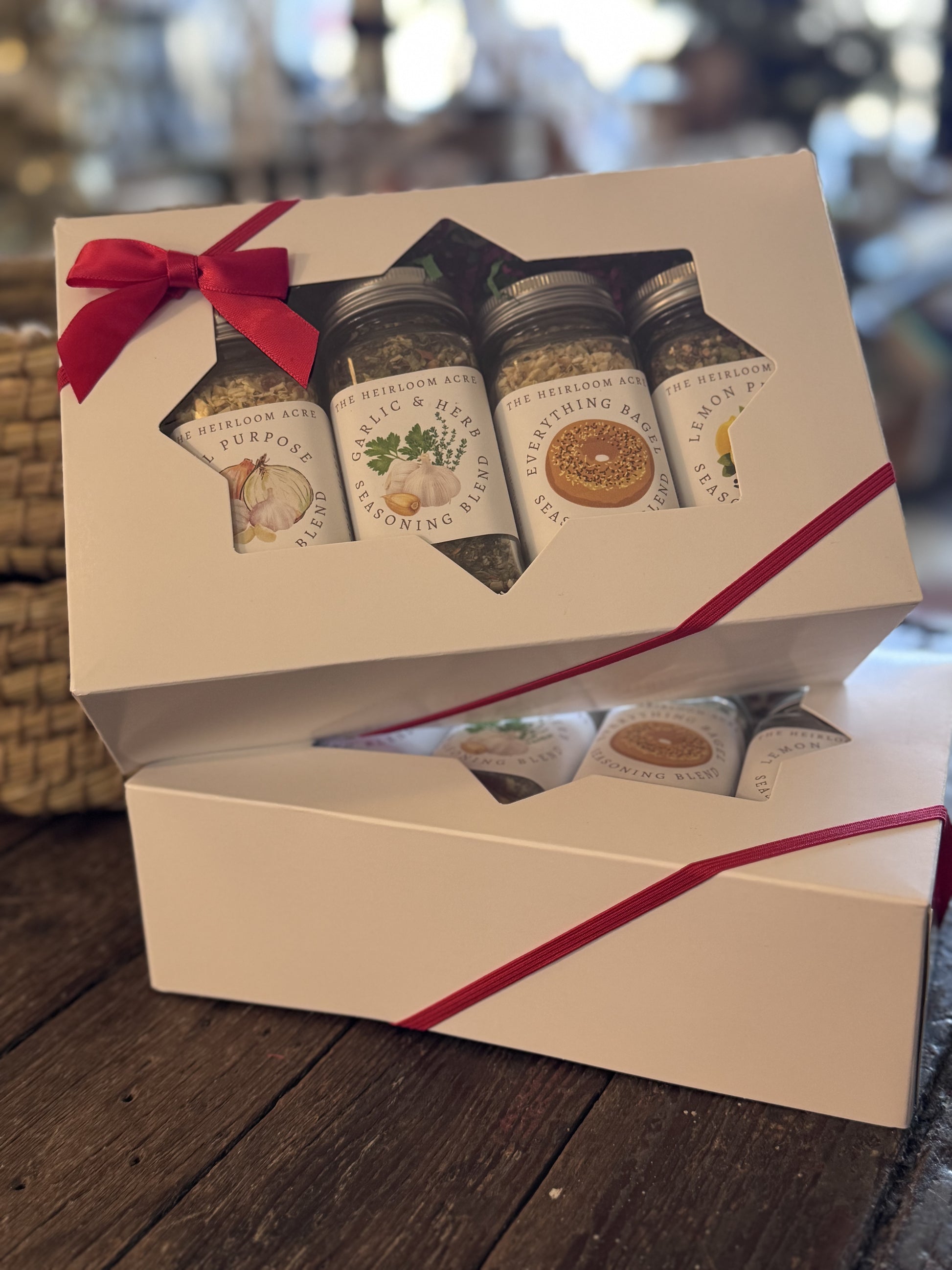 Expertly curated by a local farmer, The Heirloom Acre, our Seasoning Gift Set provides 4 flavorful options to elevate any dish. Each 4oz glass jar contains a unique blend, including All-Purpose, Garlic and Herb, Everything Bagel, and Lemon Pepper. Enhance your cooking with our handcrafted, small-batch seasonings.