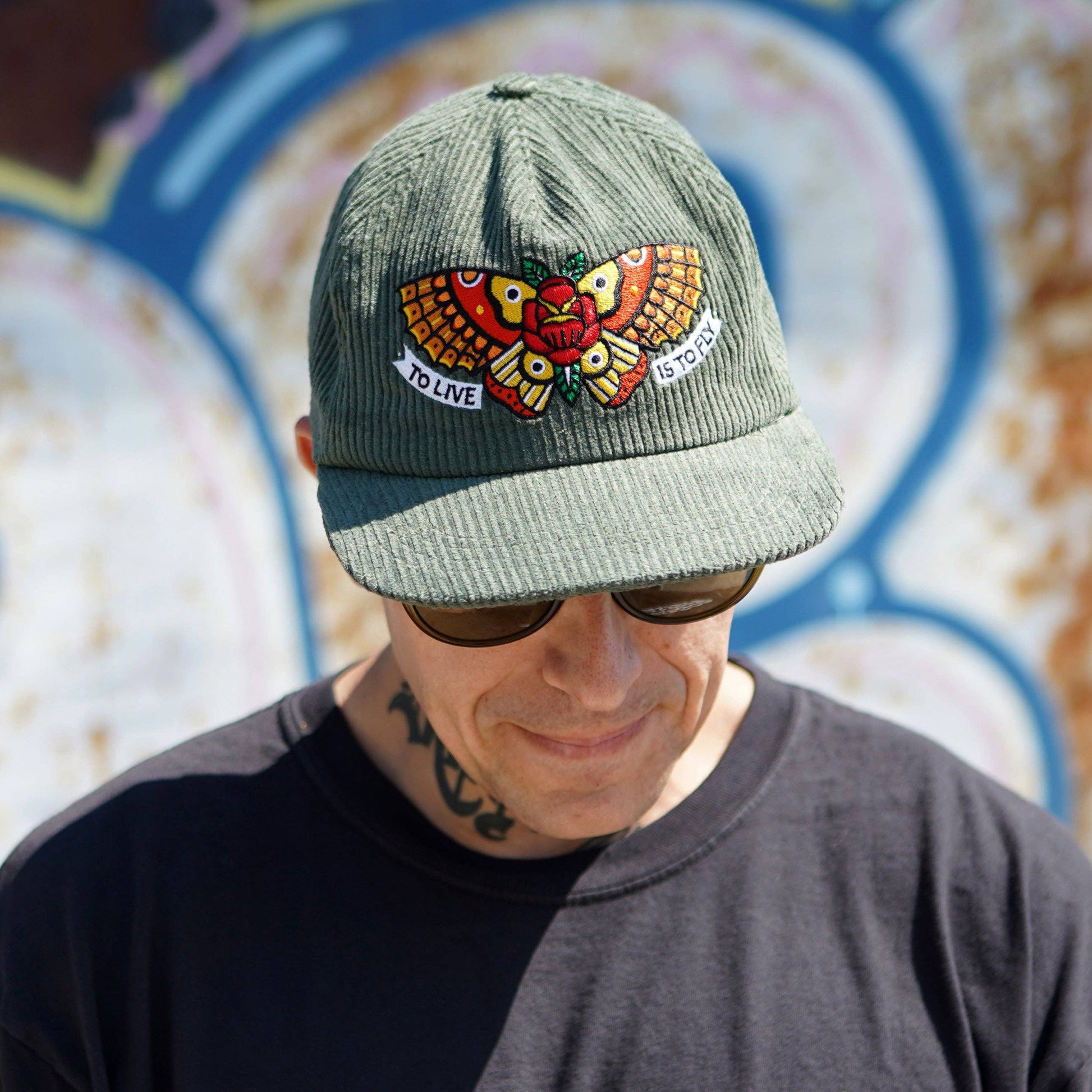 The tattoo-style butterfly is drawn by Stuntin and embroidered on a muted smoke green corduroy snapback cap that is custom made to our specifications.