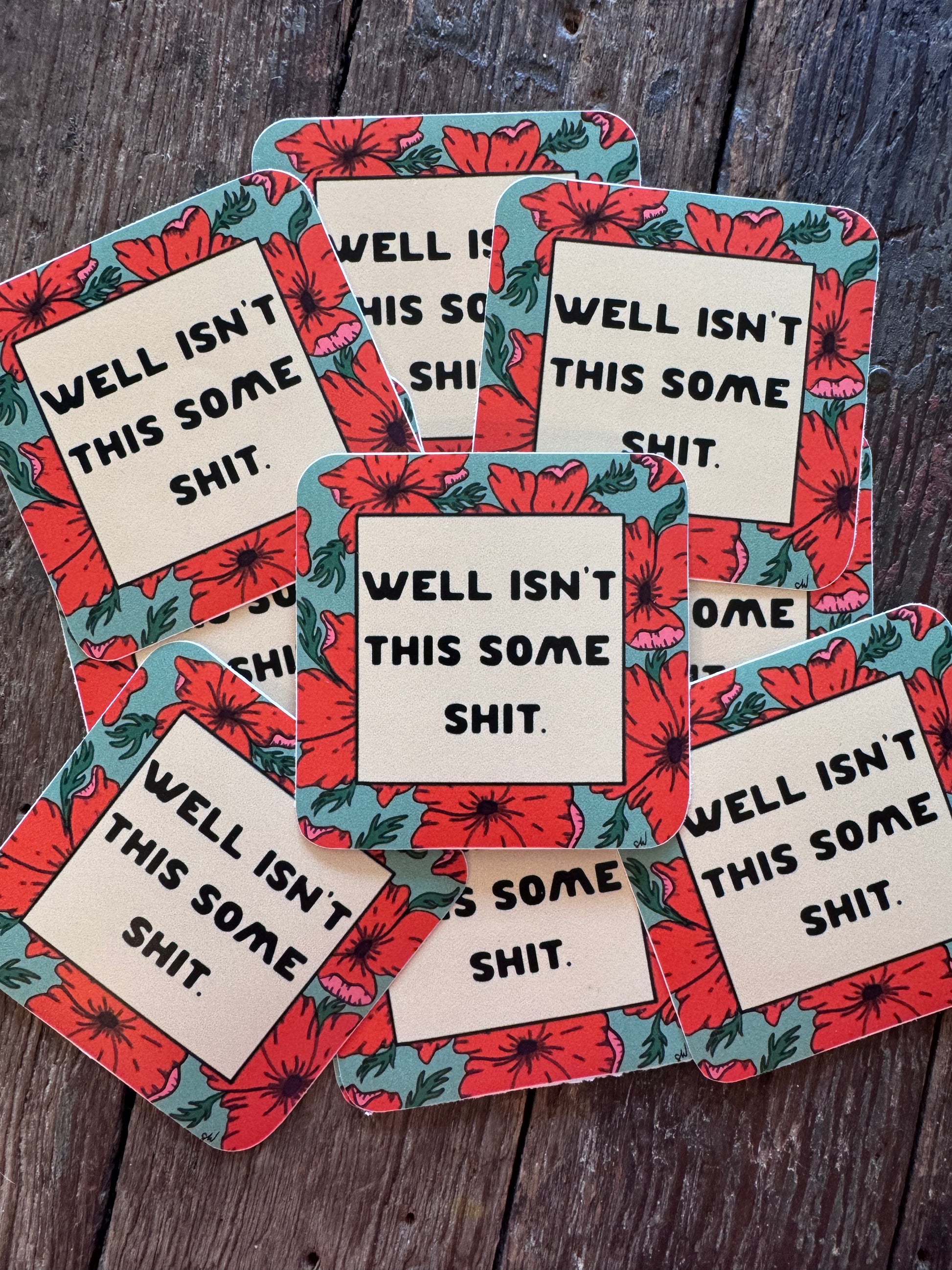 Add some humor to your day with the "Well Isn't This Some Shit" sticker! Perfect for adding some playfulness to your belongings, this sticker sums up those moments that just make you go "ugh." So go ahead, slap it on and keep it real-real.